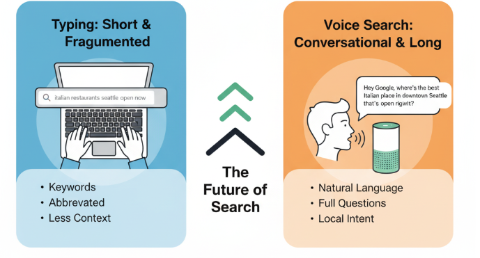 - Conversational and Long-Tail: People speak differently than they type. Voice queries are typically longer, more conversational, and often posed as full questions. (e.g., “best Italian restaurant in downtown Seattle open now” vs. “Italian restaurant Seattle”).